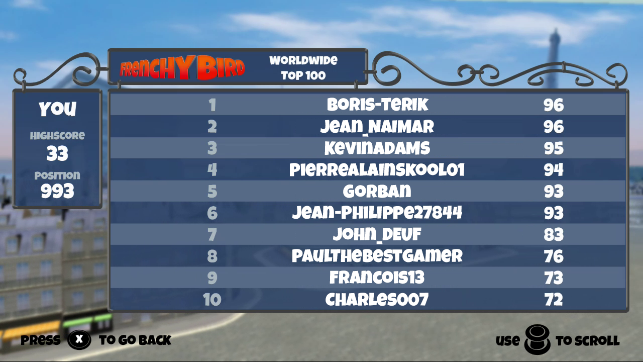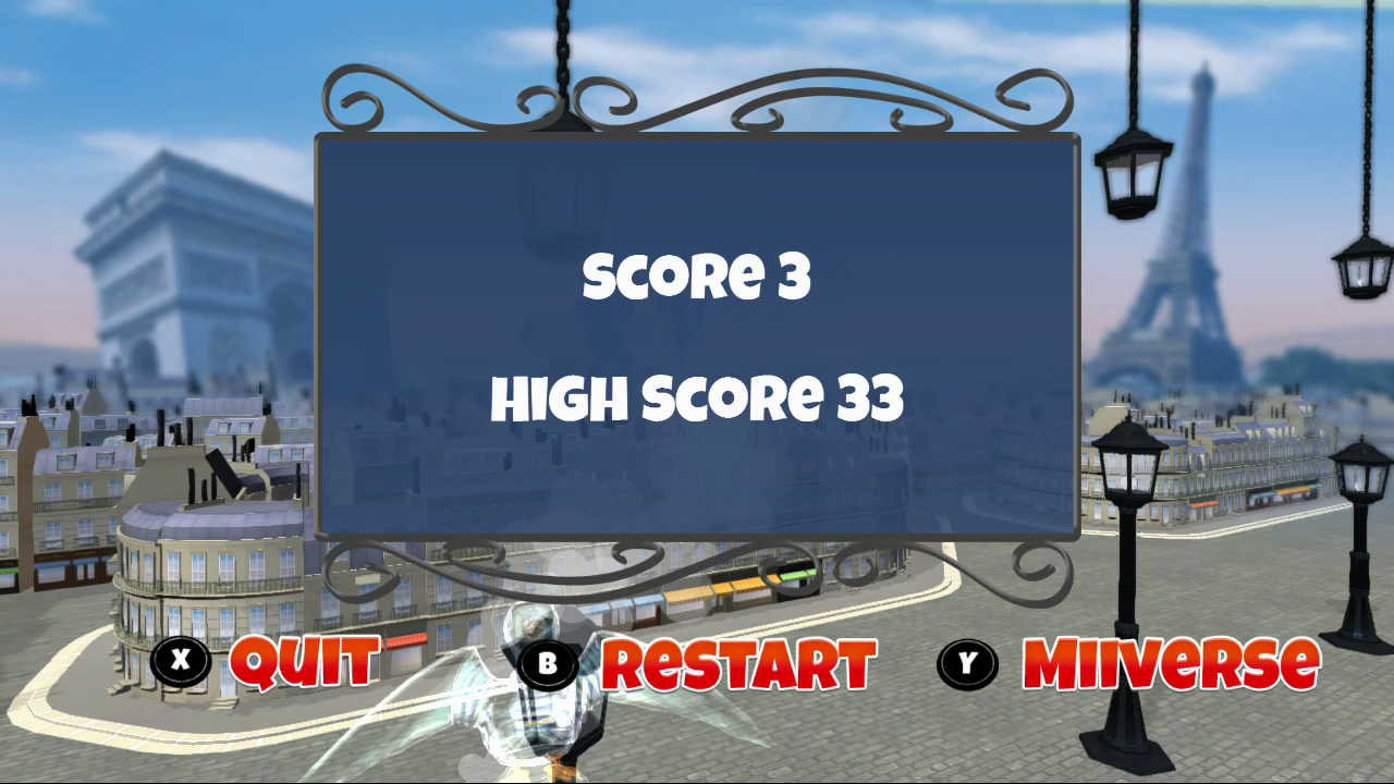 Play as a Parisian pigeon and enjoy flying through Paris streets while avoiding lamp posts ! Share your score on Miiverse™ and make your way through the top 100 worldwide ranking !